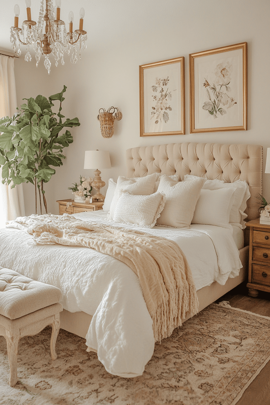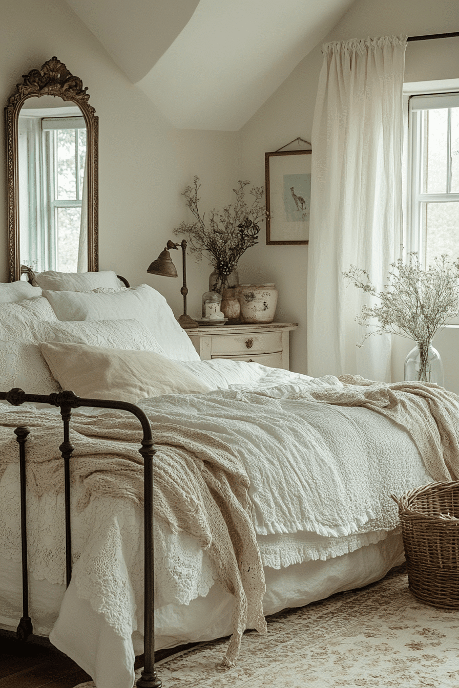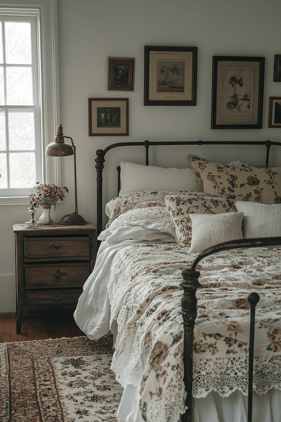 European antiques paired with relaxed textiles create elegant vintage boho bedroom ideas. Iron bed frames, faded floral wallpaper, and oak furniture add timeless beauty. Linen bedding and delicate lighting soften the look. The mix of structure and softness feels balanced. The space feels refined yet comfortable. Discover vintage boho bedroom ideas inspired by old-world charm.
