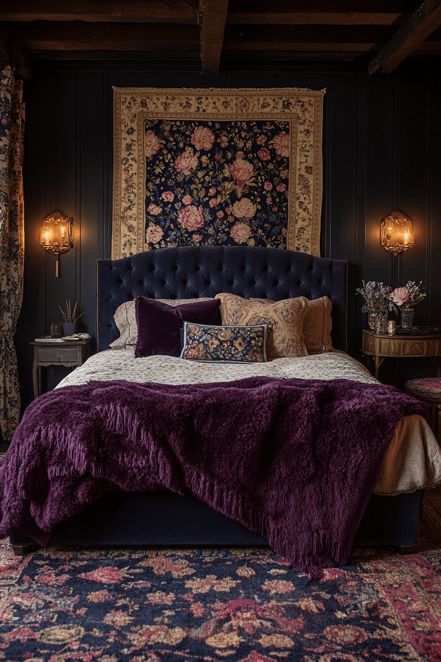 Dark jewel tones create moody vintage boho bedroom ideas full of dramatic charm. Indigo, plum, and navy textiles pair beautifully with antique metal accents. Rich tapestries and embroidered fabrics add visual depth. Dim lighting enhances the cozy atmosphere. The room feels intimate and artistic. Discover vintage boho bedroom ideas inspired by tapestry textures.