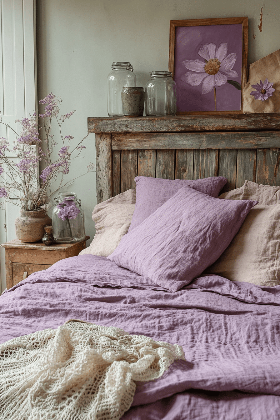 Muted purple tones introduce gentle romance to vintage boho bedroom ideas. Mauve bedding and lavender accents soften the vintage furniture. Lace fabrics and faded rugs add elegance. Dried lavender or candles create calming fragrance and warmth. The room feels serene and dreamy. Explore vintage boho bedroom ideas with soft mauve hues.