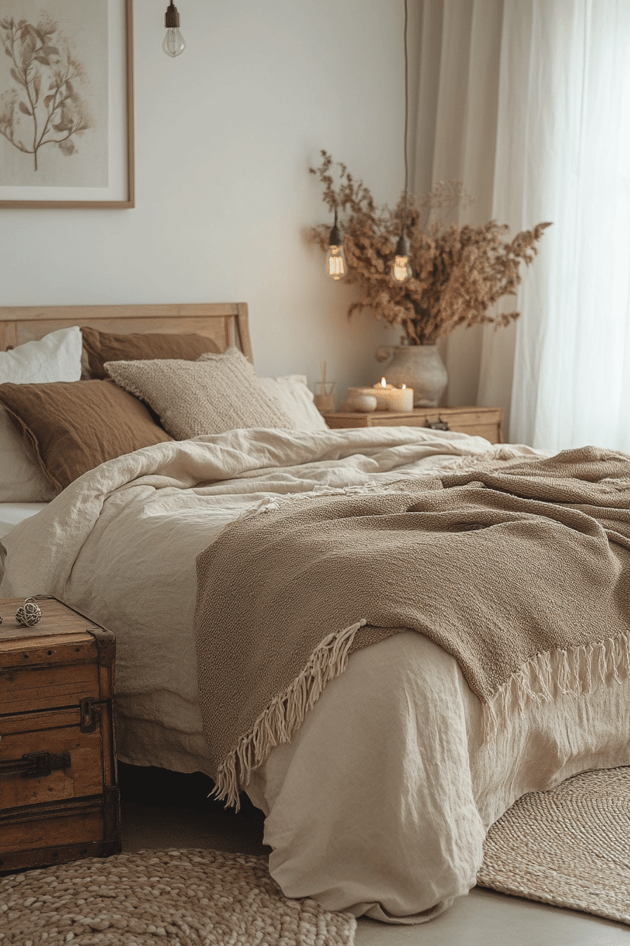 Warm monochrome palettes enhance vintage boho bedroom ideas with earthy elegance. Sepia photography, caramel textiles, and aged furniture create depth. Macramé and rattan accents introduce natural texture. The colors stay cohesive while still feeling rich. The room feels soulful and calm. Explore vintage boho bedroom ideas styled with sepia tones.