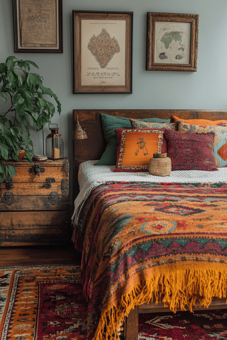 Travel-inspired decor adds personality to vintage boho bedroom ideas filled with wanderlust. Tribal rugs, wooden trunks, and kantha quilts create layered texture. Woven wall art and global artifacts enhance the theme. The room feels collected through years of exploration. History and culture blend beautifully. Browse vintage boho bedroom ideas inspired by nomadic style.