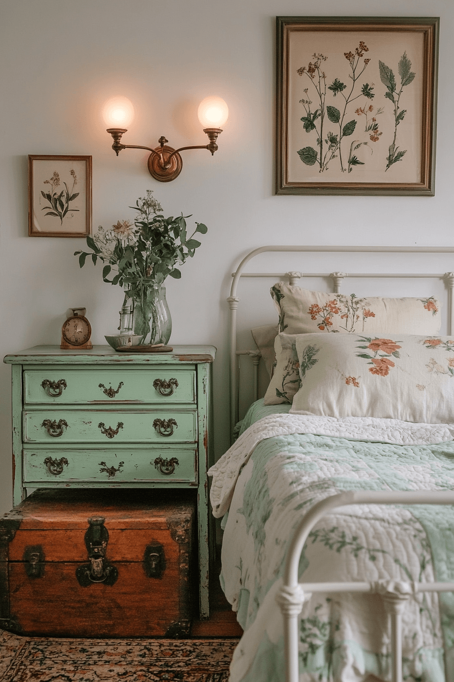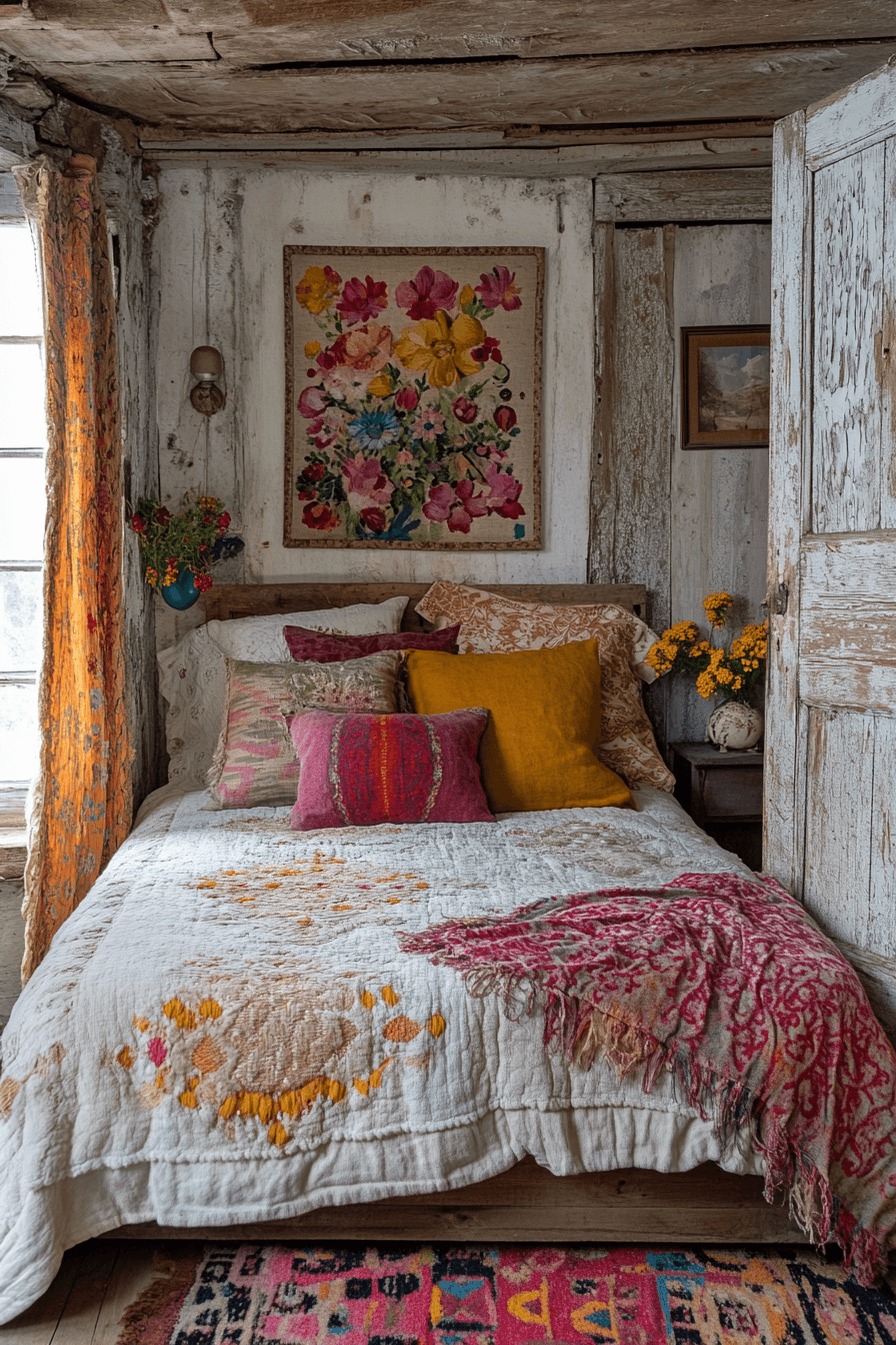 Aged finishes bring soulful charm to vintage boho bedroom ideas filled with character. Weathered dressers, chipped paint, and faded textiles create a beautifully lived-in look. Lace curtains and patterned bedspreads soften the rustic details. Vintage trunks or suitcases double as stylish storage. The room feels warm, nostalgic, and welcoming. Explore more vintage boho bedroom ideas that celebrate timeworn beauty.