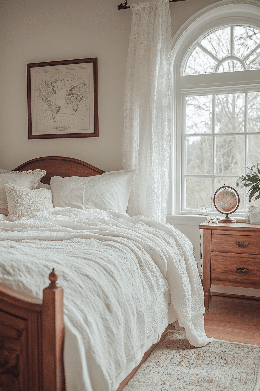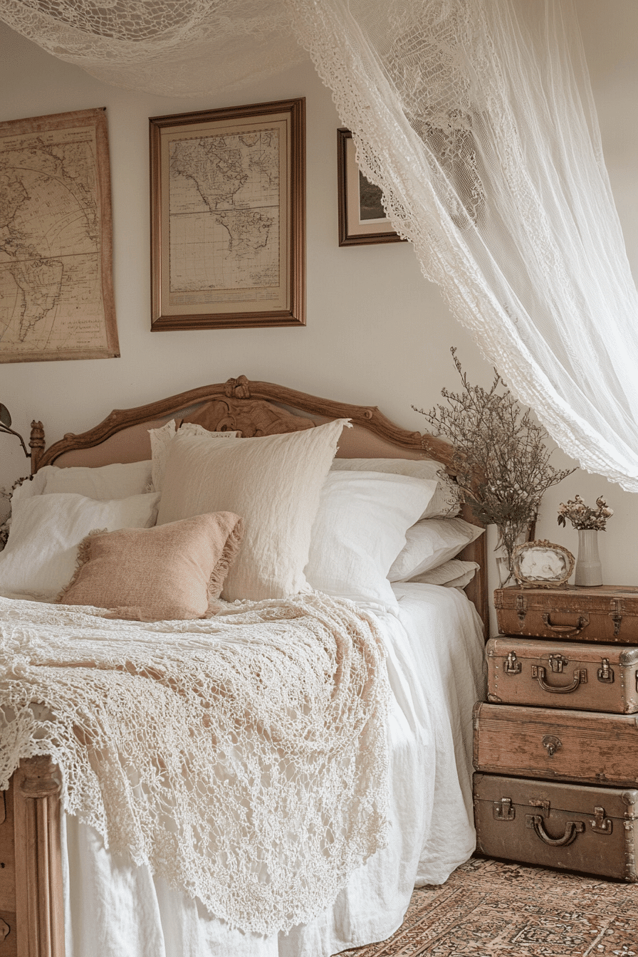 Delicate lace combined with travel accents creates romantic vintage boho bedroom ideas. Cream bedding, brass candleholders, and layered textiles add elegance. Vintage maps or globes enhance the wanderlust theme. The palette stays light and airy. The result feels nostalgic and graceful. Explore vintage boho bedroom ideas inspired by wanderlust lace.