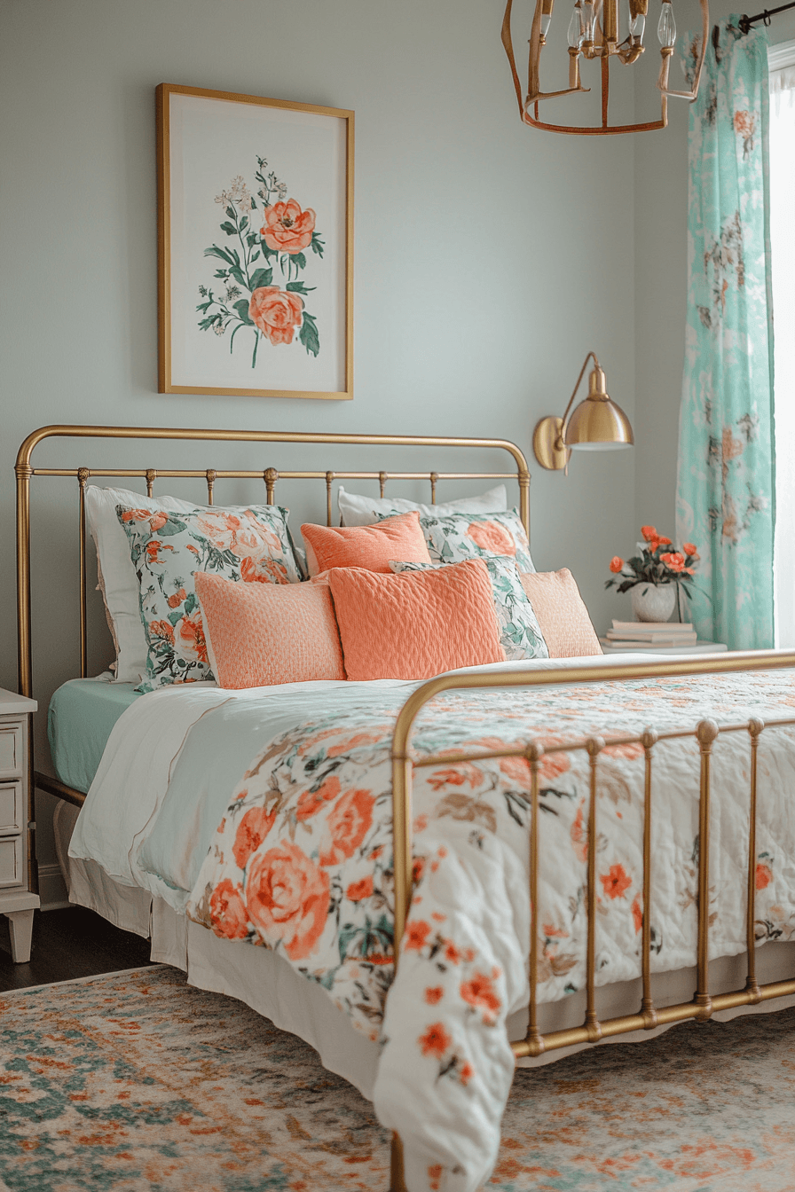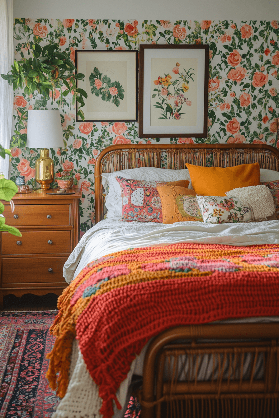 Retro-inspired patterns can add playful personality to vintage boho bedroom ideas. Floral prints, rattan mirrors, and crochet throws channel cheerful mid-century style. Antique furniture pieces balance the colorful accents. Mustard, coral, and peach tones brighten the palette. Fresh flowers in vintage vases complete the look. See more vintage boho bedroom ideas inspired by retro charm.