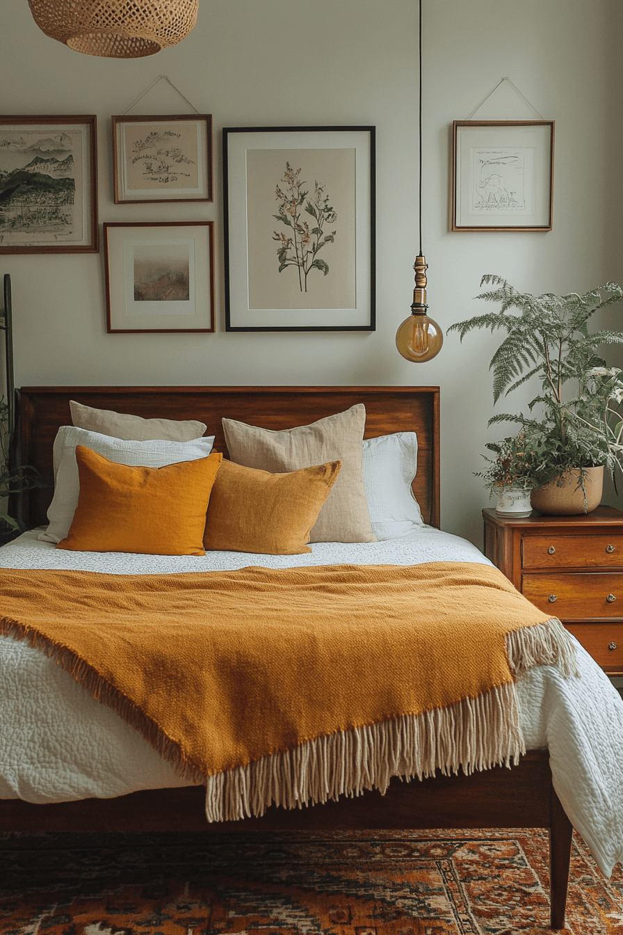 Golden tones and tasseled decor bring shimmer into vintage boho bedroom ideas. Mustard bedding and brass accents add warmth to the palette. Macramé and vintage rugs introduce bohemian texture. Soft lighting enhances the golden glow. The space feels vibrant and cozy. Discover vintage boho bedroom ideas with golden fringe warmth.