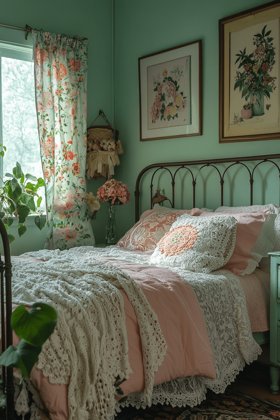 Pastel lace and retro decor create playful vintage boho bedroom ideas. Crochet blankets, scalloped bedding, and vintage lamps add nostalgic charm. Woven wall art and jute rugs maintain the bohemian balance. The palette feels soft and cheerful. The design feels sweet and inviting. Browse vintage boho bedroom ideas inspired by retro lace details.
