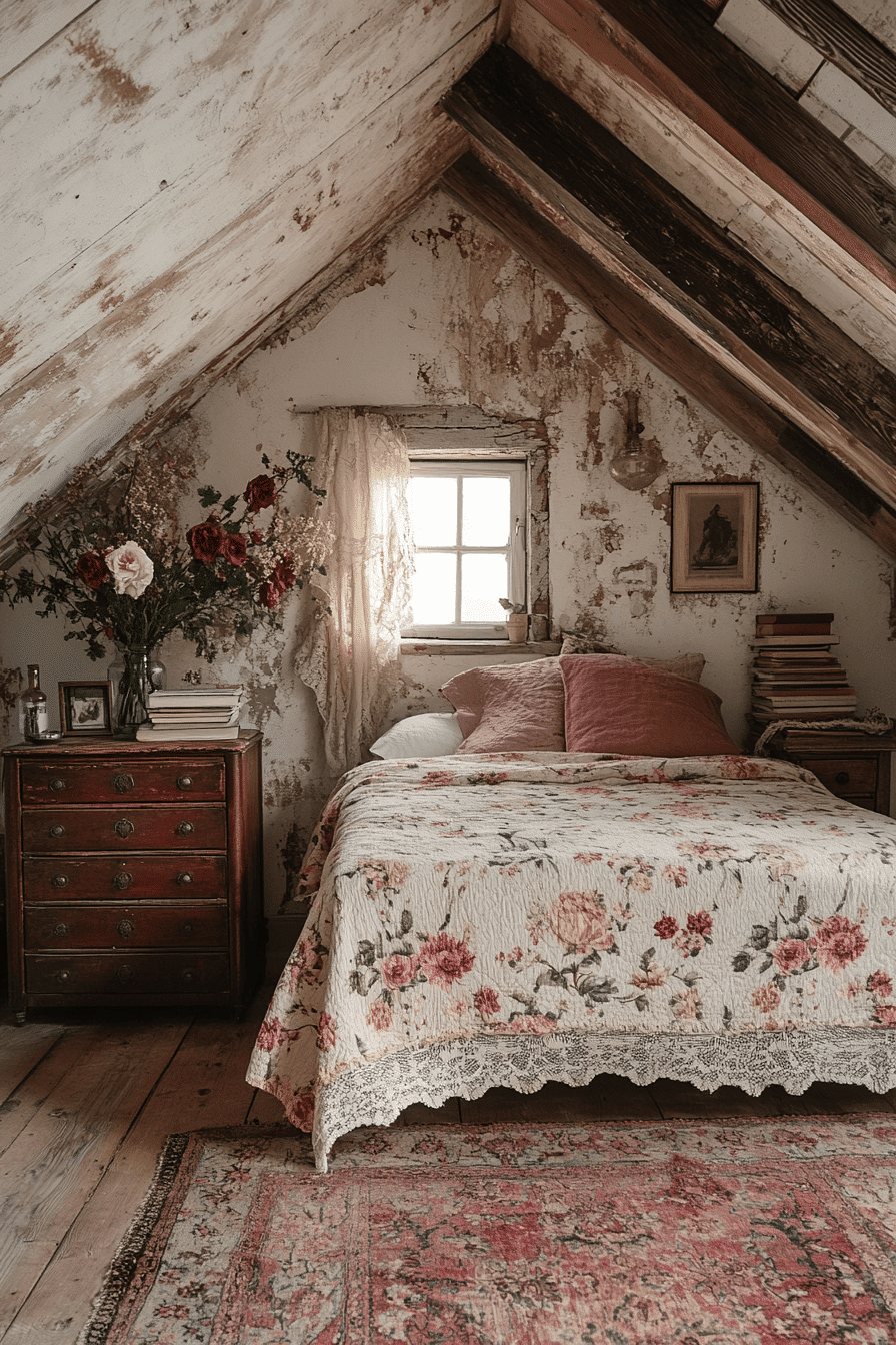 Floral prints and antique accents create garden-inspired vintage boho bedroom ideas. Faded linens, dried bouquets, and vintage frames add romantic texture. Natural light through lace curtains enhances the soft atmosphere. Wooden furniture keeps the look grounded. The room feels like a hidden retreat. Discover vintage boho bedroom ideas inspired by attic blooms.