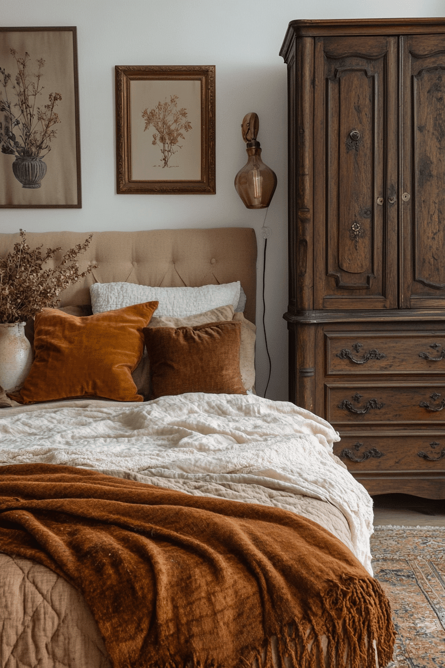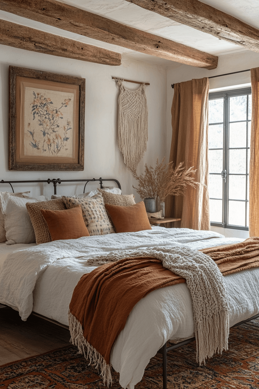 Terracotta and rust tones bring warmth into vintage boho bedroom ideas with earthy charm. Burnished orange pillows and faded textiles create a sun-warmed palette. Vintage metal accents and ceramic decor enhance the rustic feel. Distressed white furniture adds contrast. The result feels relaxed and cozy. Discover vintage boho bedroom ideas inspired by warm rust tones.