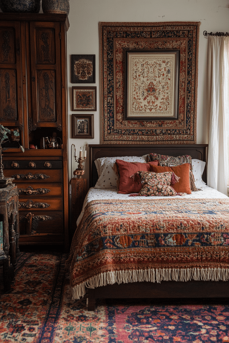 Heirloom textiles bring storytelling into vintage boho bedroom ideas with layers of meaningful detail. Hand-stitched quilts, embroidered pillows, and lace accents create warmth and nostalgia. Mixing thrifted finds with family treasures adds authenticity. Carved wooden furniture deepens the vintage aesthetic. Each element contributes to a personal narrative. Browse vintage boho bedroom ideas that celebrate heirloom style.