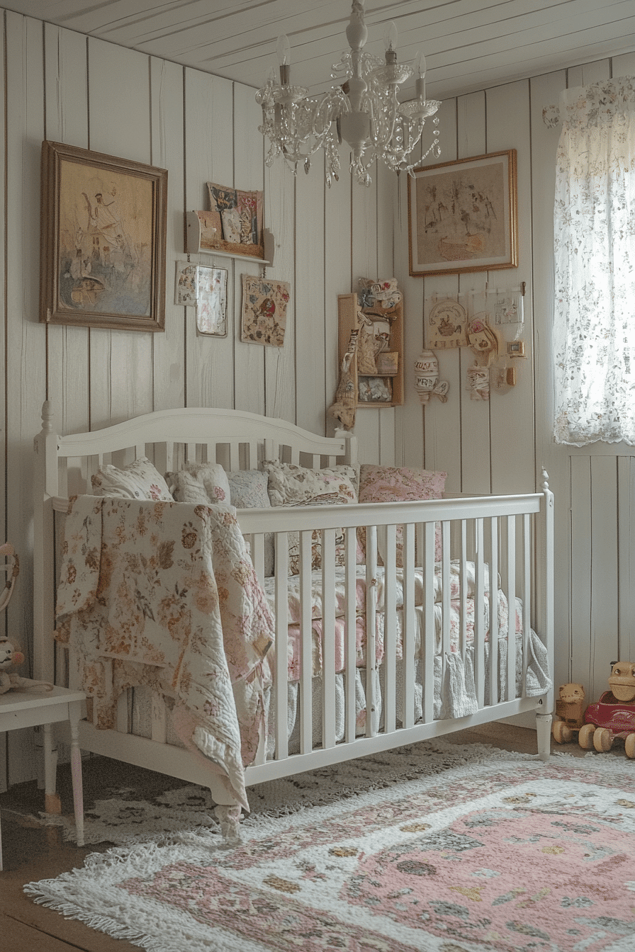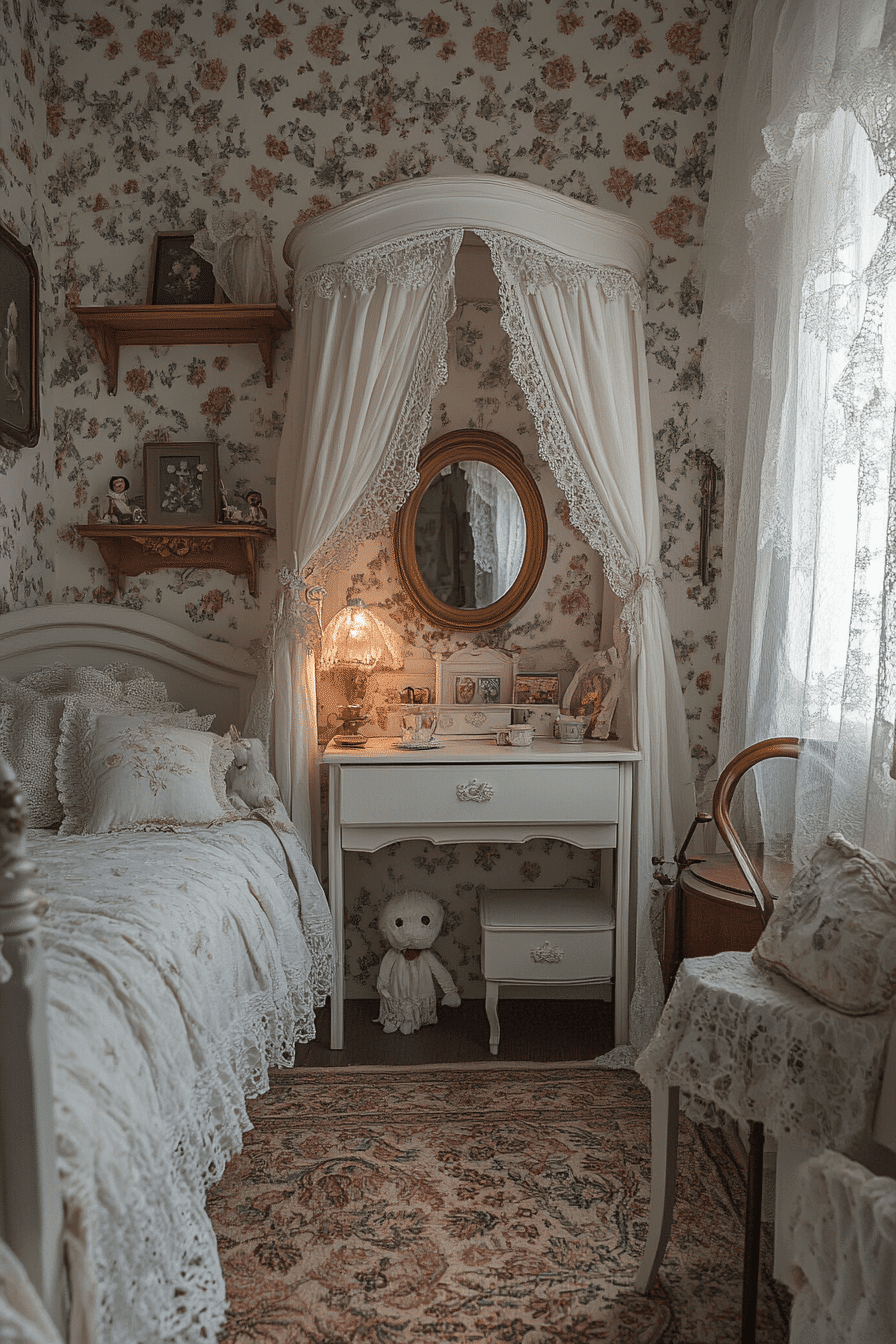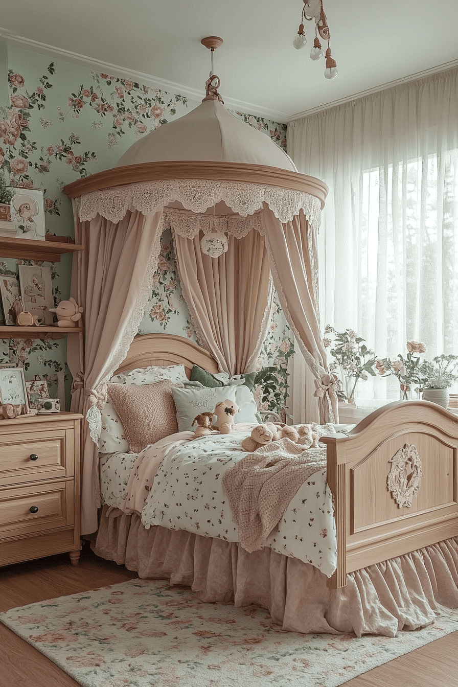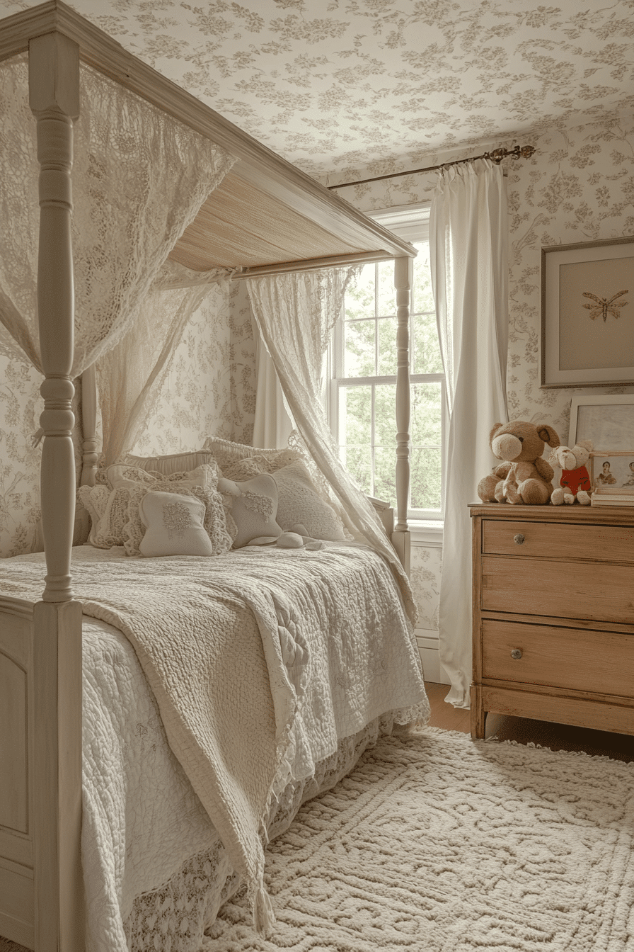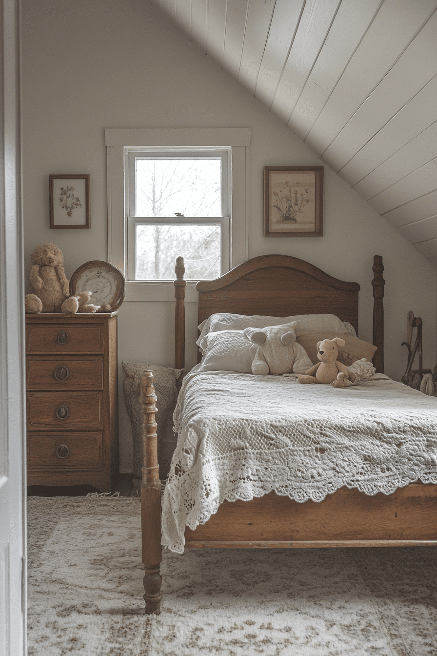 Soft pastel hues and delicate textures come together to create a dreamy, whimsical space full of charm. This vintage kids room blends lace curtains, cozy quilts, and classic wooden toys for a nostalgic feel. Antique-style furniture like petite dressers and canopy beds adds timeless character. Layered fabrics make the room warm and inviting. Every detail encourages creativity and comfort. Explore more whimsical vintage kids room ideas that feel like a storybook dream.
