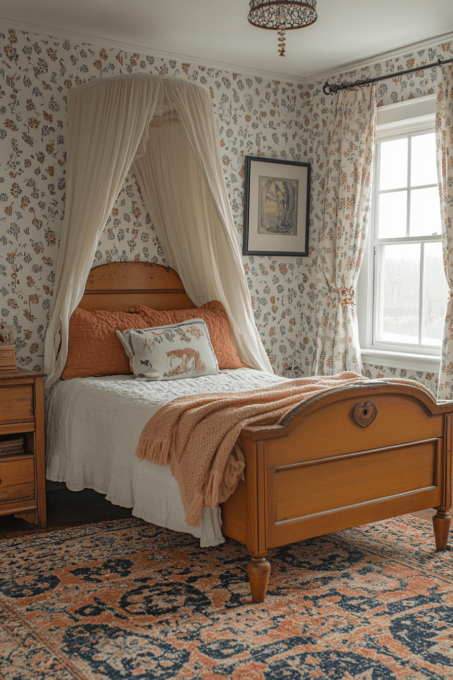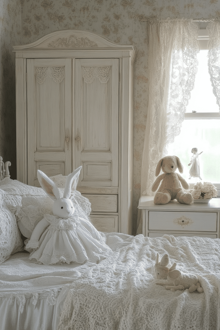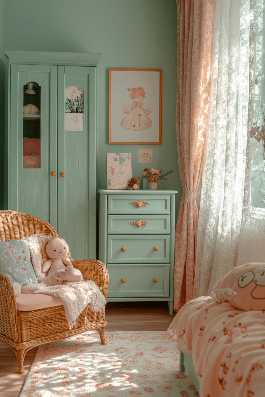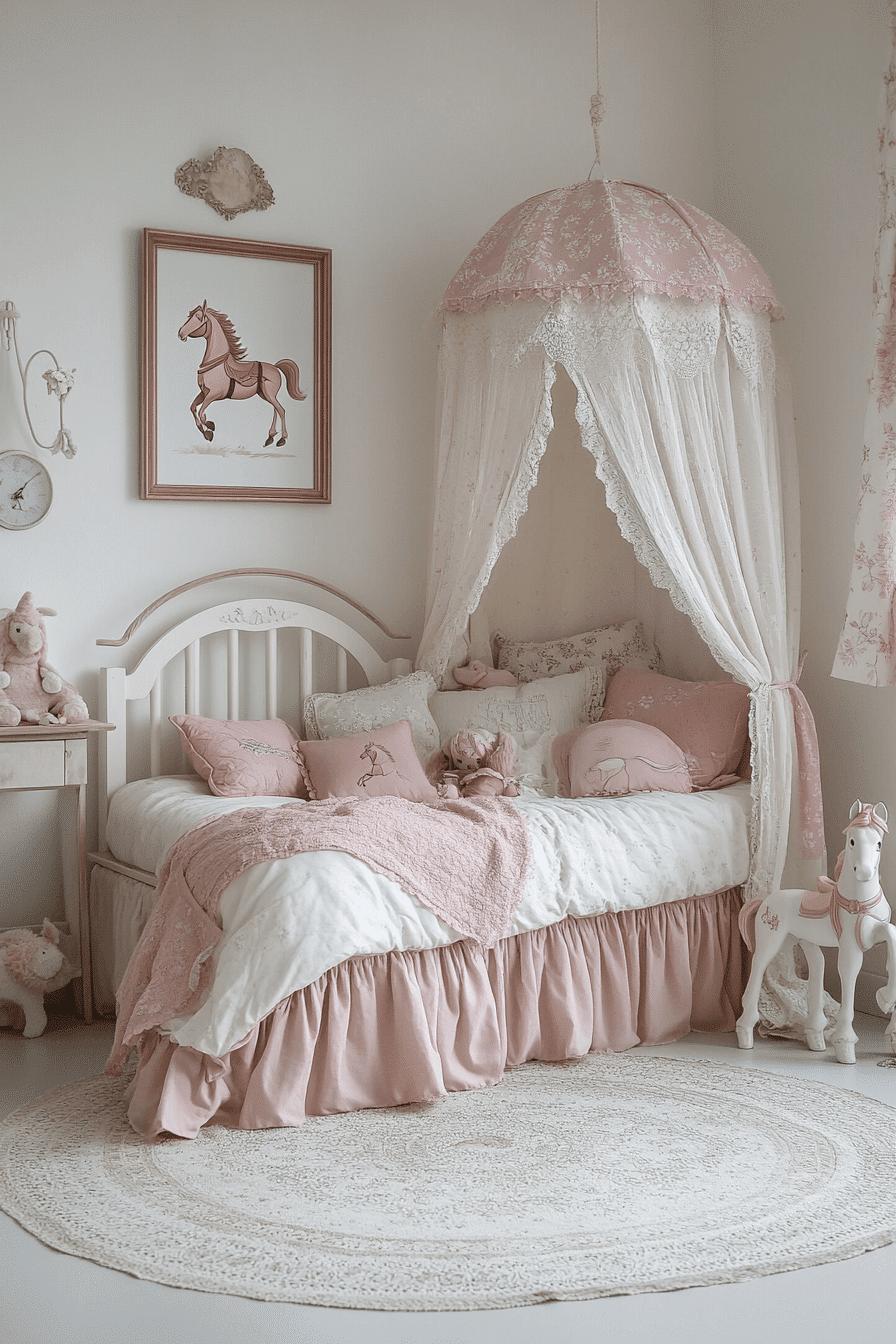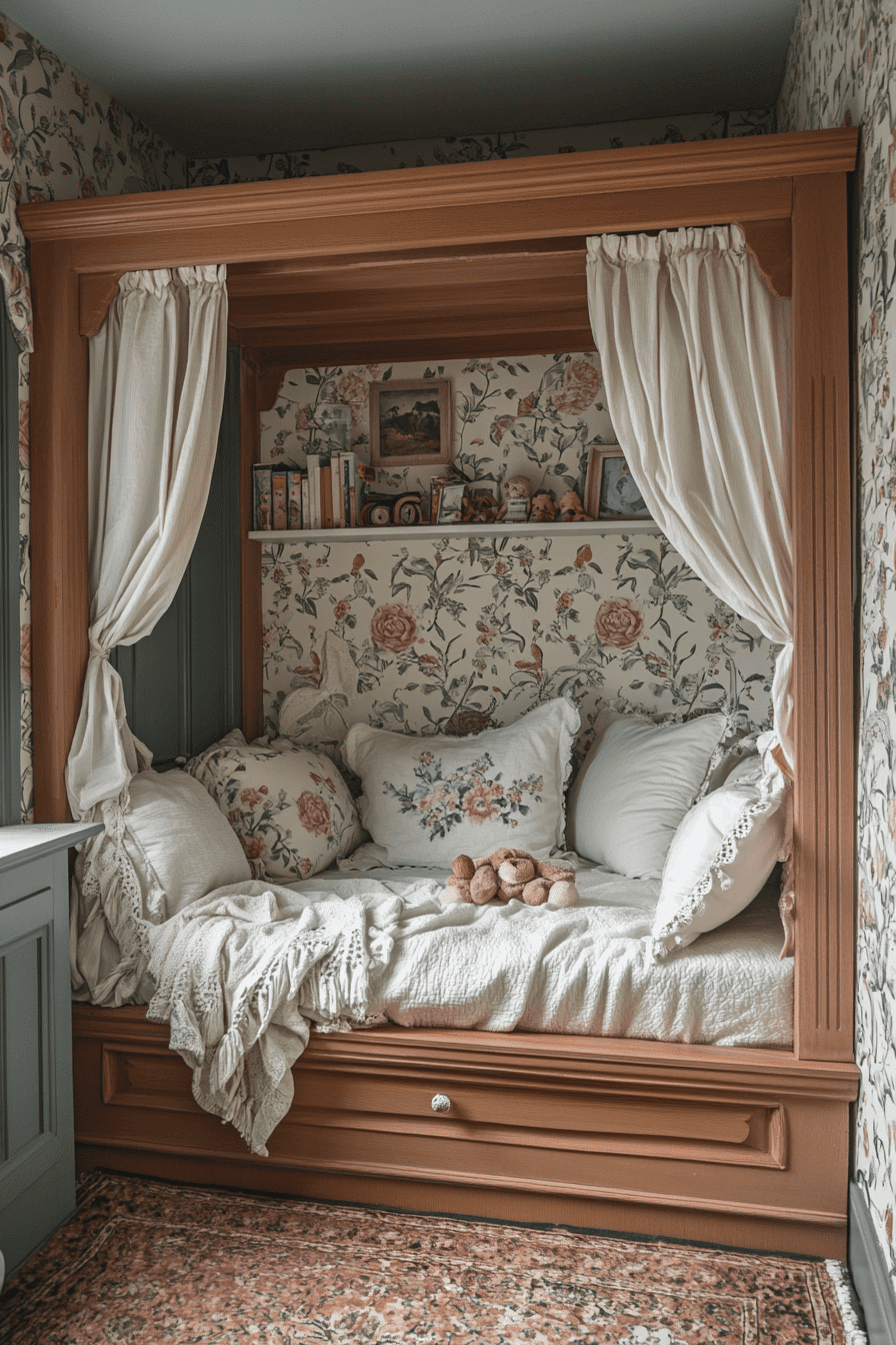 Soft pastel hues and delicate textures come together to create a dreamy, whimsical space full of charm. This vintage kids room blends lace curtains, cozy quilts, and classic wooden toys for a nostalgic feel. Antique-style furniture like petite dressers and canopy beds adds timeless character. Layered fabrics make the room warm and inviting. Every detail encourages creativity and comfort. Explore more whimsical vintage kids room ideas that feel like a storybook dream.