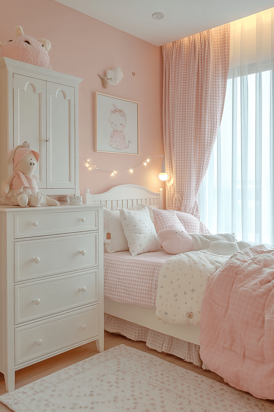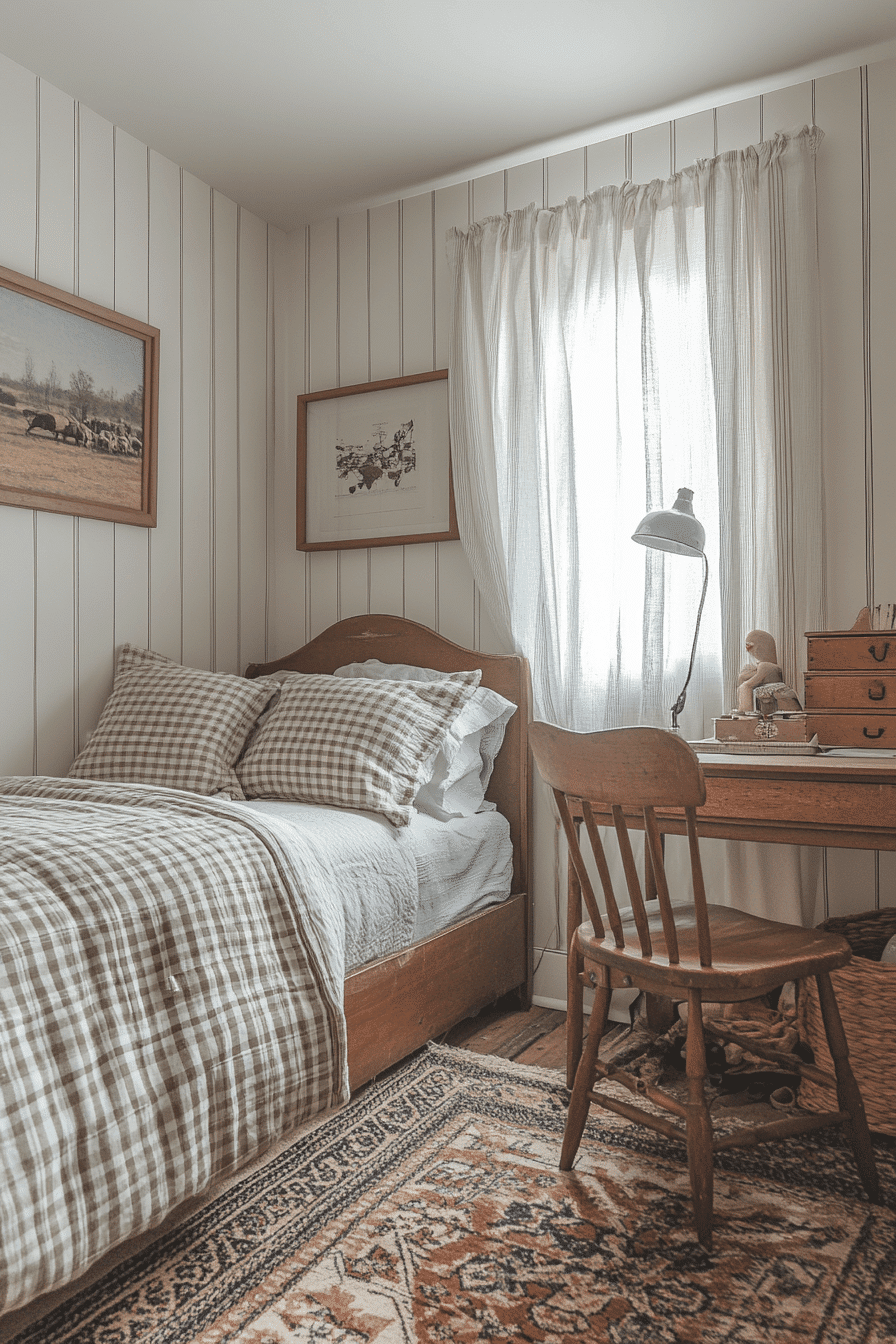 Gingham patterns bring playful simplicity and timeless charm into the space. This vintage kids room uses checked fabrics across bedding and curtains for cohesion. White furniture enhances the clean aesthetic. Small decorative accents complete the nostalgic look. The design feels cheerful and balanced. Explore more gingham vintage kids room ideas for classic style.