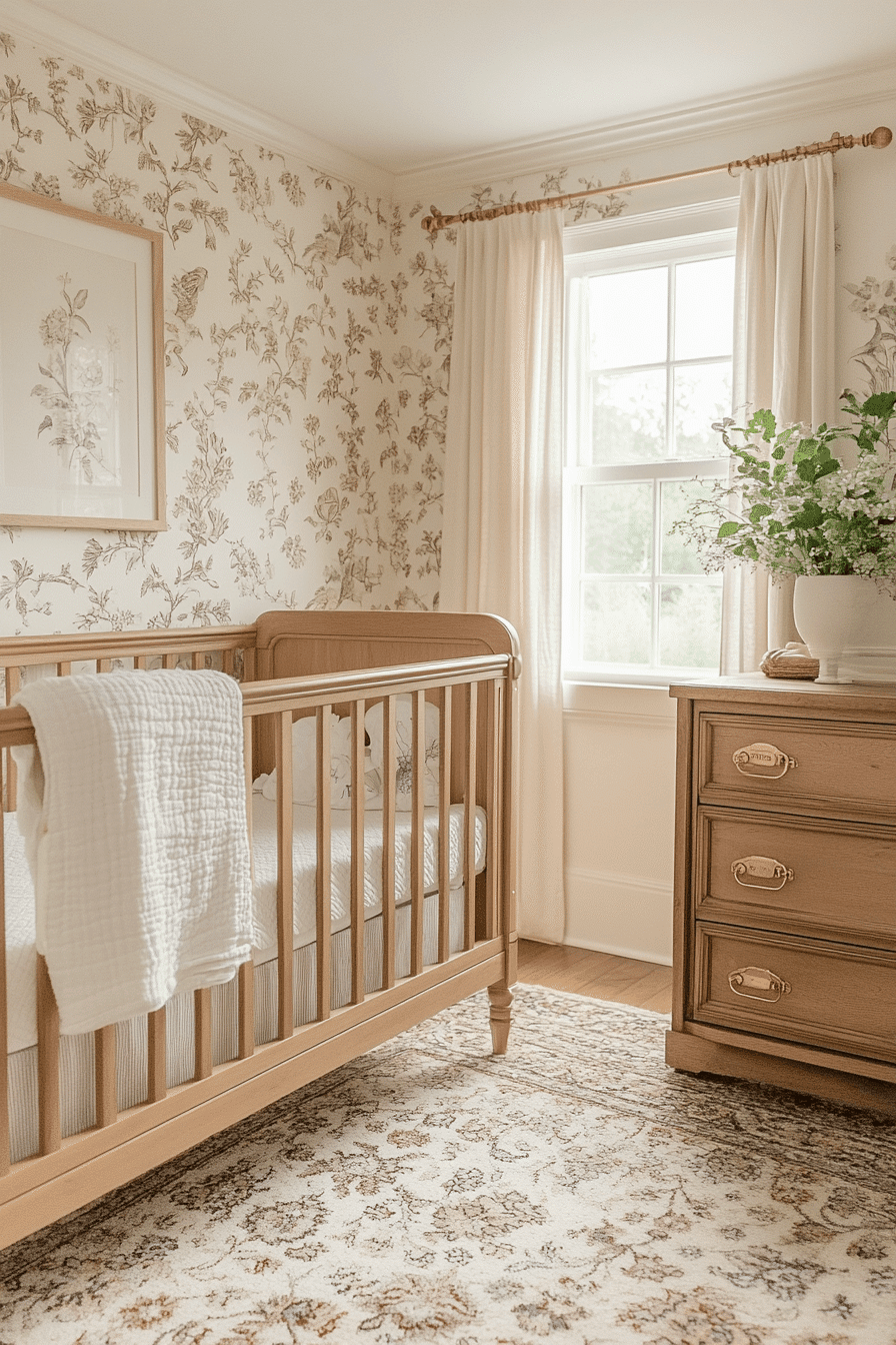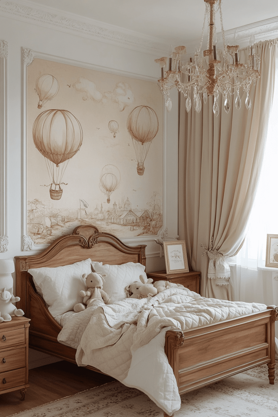 Neutral tones create a calm and elegant environment that feels soft and inviting. This vintage kids room uses beige, ivory, and gray shades for harmony. Wooden furniture enhances the understated palette. Layered curtains add texture and depth. The design feels timeless and cozy. Explore more neutral vintage kids room ideas for a soothing space.