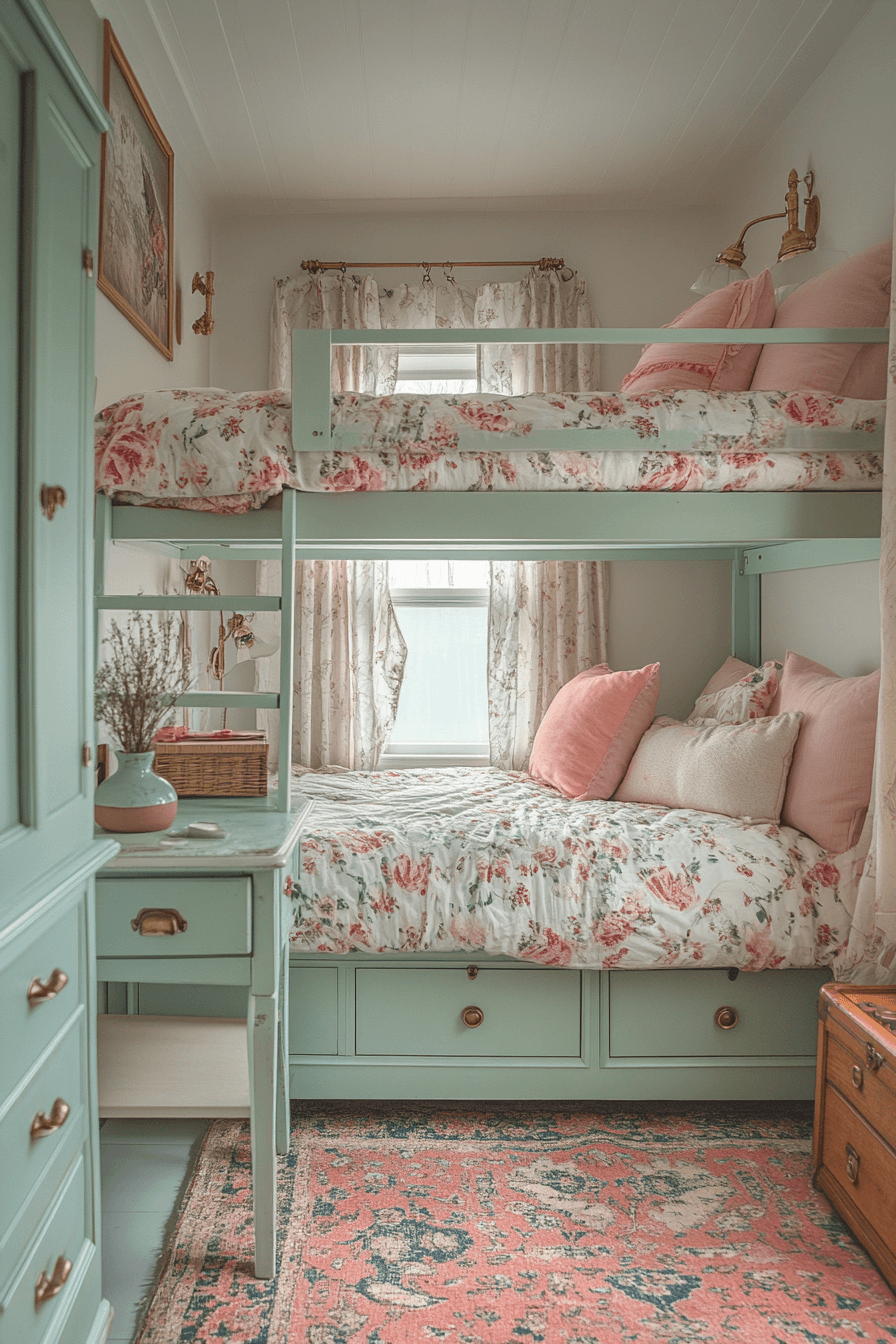 Charming bunk beds create both practicality and cozy appeal for shared spaces. This vintage kids room features soft-painted beds with floral bedding for cohesion. Antique lighting enhances the nostalgic feel. Wooden ladders add character and function. The space feels warm and organized. Explore more bunk bed vintage kids room ideas for shared comfort.