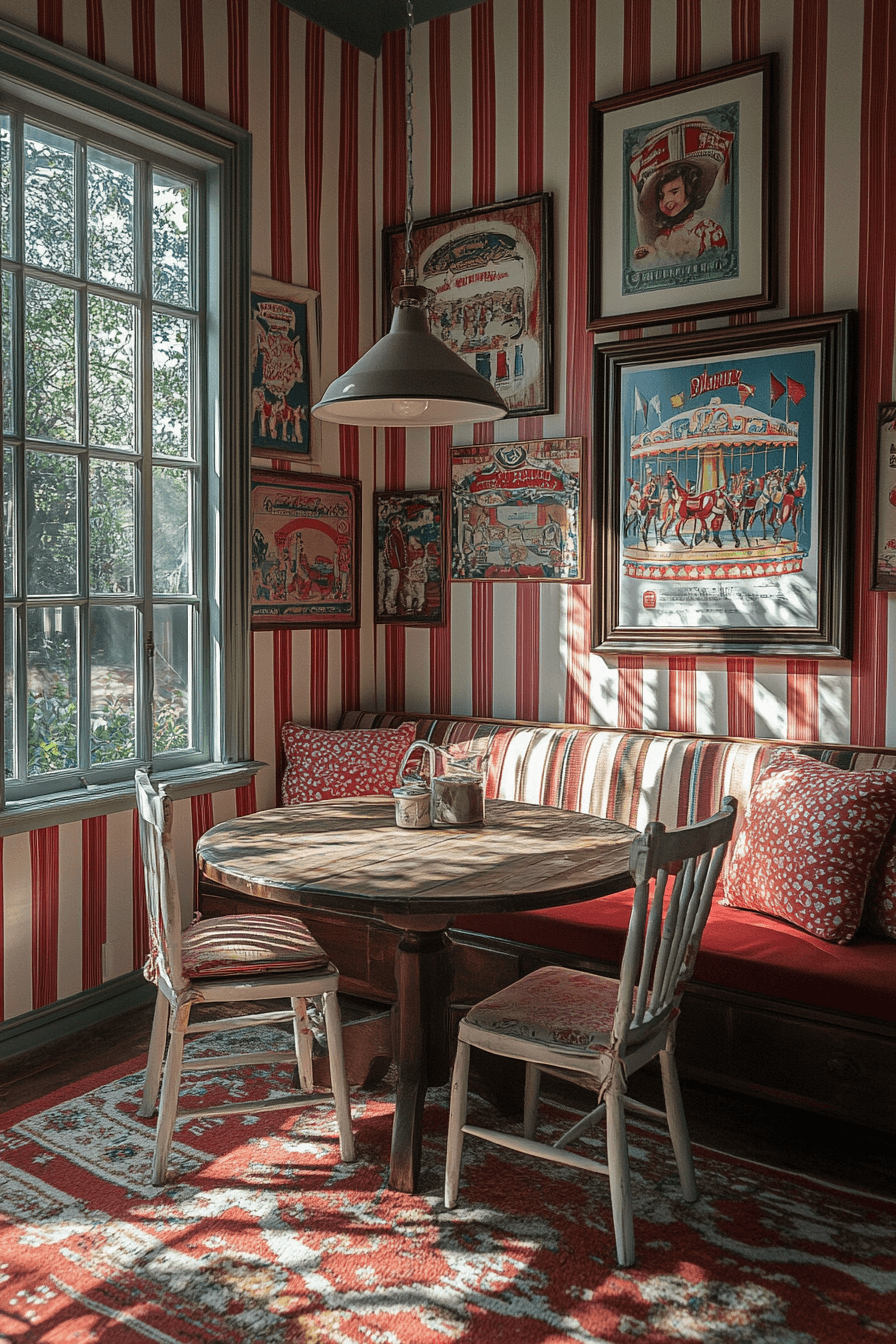 Circus-inspired elements bring lively energy and vintage flair into the space. This vintage kids room uses striped wallpaper and retro décor for a bold look. Wooden storage keeps the design practical. Bright accents add personality without clutter. The space feels cheerful and imaginative. Discover more circus-themed vintage kids room ideas for fun styling.