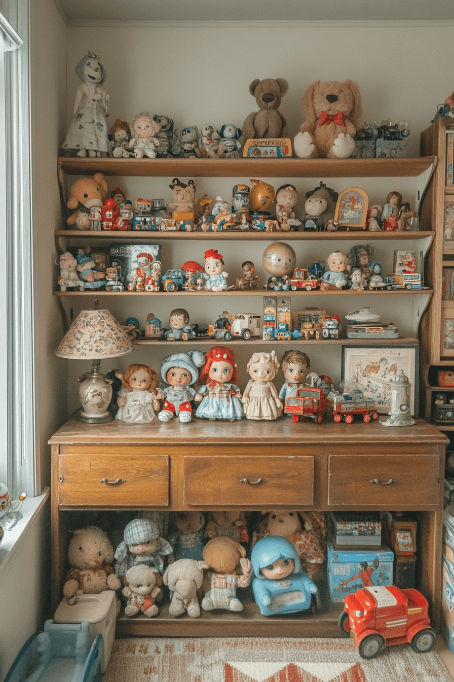 Timeless toy collections take center stage, bringing nostalgia and personality into the design. This vintage kids room highlights classic dolls, tin cars, and wooden puzzles displayed on open shelving. A neutral backdrop allows each piece to stand out beautifully. Warm lighting creates a cozy and inviting atmosphere. The space feels both playful and meaningful. Discover more vintage kids room ideas inspired by treasured toys and childhood memories.