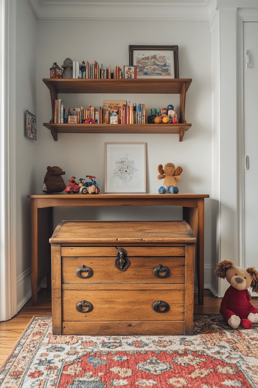 A large vintage toy chest becomes both a practical storage solution and a charming focal point. This vintage kids room uses wooden trunks to organize toys with style. Displayed toys add to the nostalgic feel. The design feels clean and intentional. Every detail supports both function and beauty. Explore more toy chest vintage kids room ideas for smart storage.