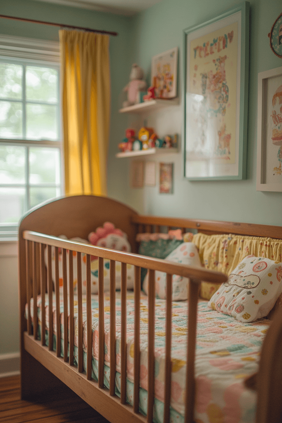 Gentle pastel tones brighten the room with a playful yet calming atmosphere. This vintage kids room uses mint, blush, and soft yellow shades for a cheerful palette. Curved wooden furniture enhances warmth and elegance. Vintage bedding completes the cozy look. The design feels balanced and inviting. Discover more pastel vintage kids room ideas that feel light and joyful.