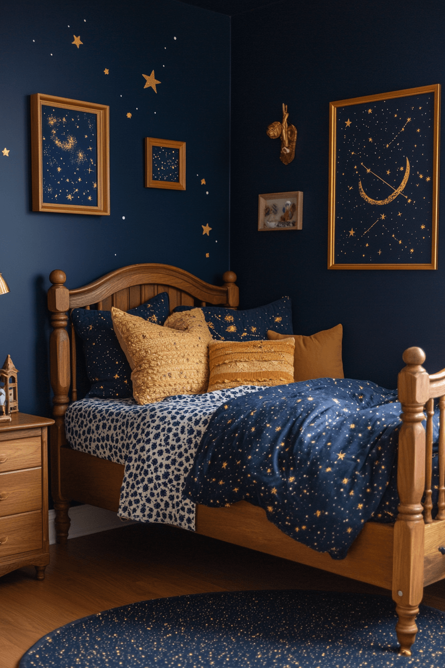 Starry night elements create an enchanting environment filled with wonder and calm. This vintage kids room uses deep blue tones with golden accents for contrast. Antique lighting adds warmth. A small telescope sparks imagination. The design feels magical and cozy. Explore more starry vintage kids room ideas for a dreamy escape.