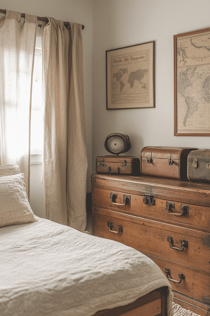 Travel-inspired décor brings a sense of adventure and imagination into the design. This vintage kids room uses suitcases, globes, and antique maps to tell a story. Soft blues and creams keep the palette calm and balanced. Wooden trunks add both storage and charm. The space feels creative and timeless. Discover more travel-inspired vintage kids room ideas for curious minds.