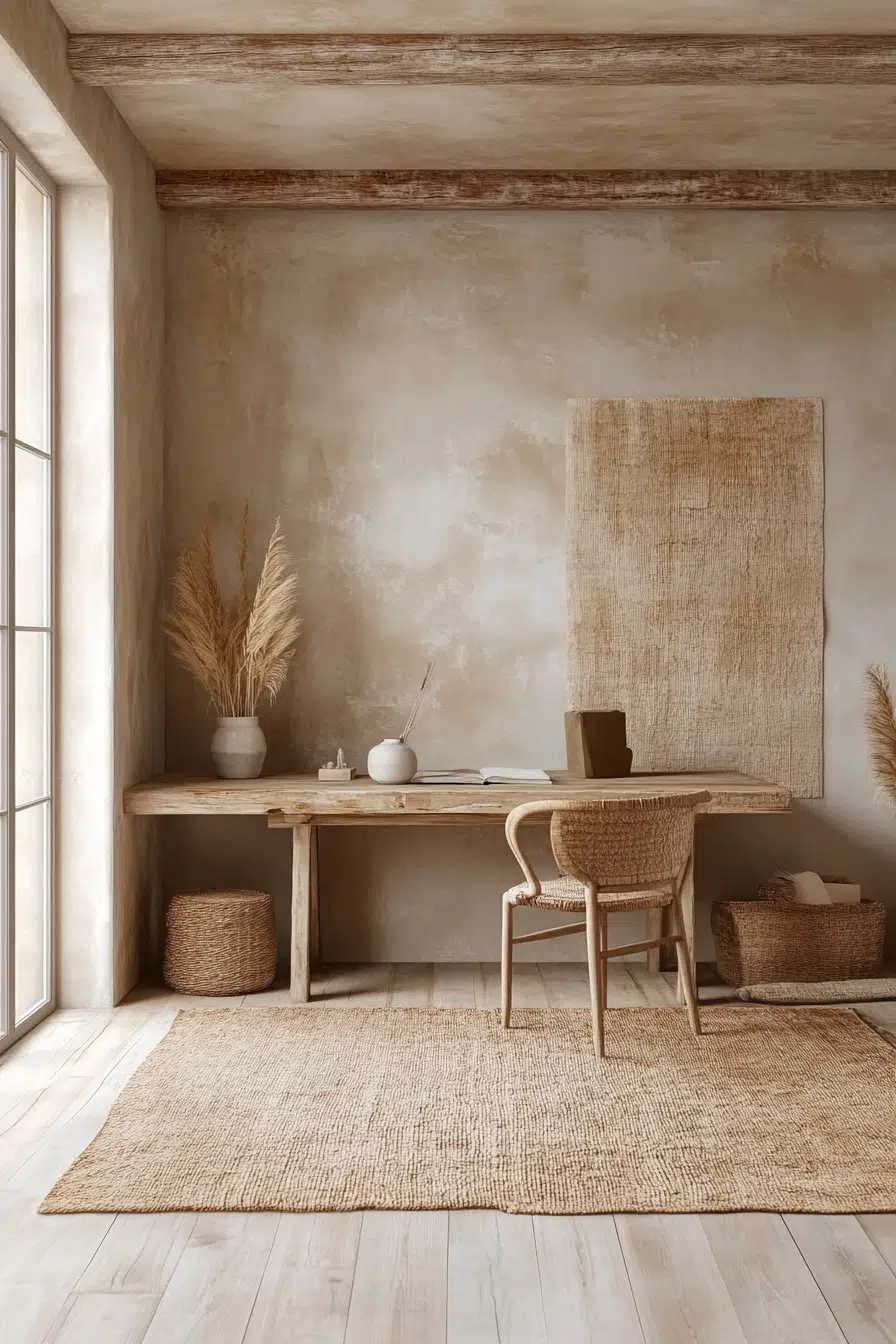 Functional Beauty in a Wabi Sabi office highlights the importance of both form and purpose. Every element in this space serves a function while adding to its aesthetic appeal.